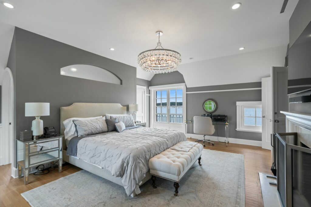 Upstairs, the primary ensuite bedroom features a fireplace, panoramic water views, a marble bath with a crystal chandelier, a large walk-in closet, and gleaming hardwood floors. Two additional bedrooms share a Jack & Jill bath.